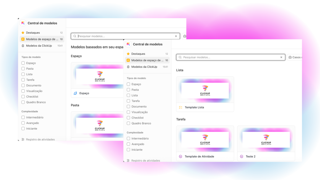 Modelos de espaços, pastas, listas, tarefas e muito mais. Basta copiar e adaptar ao seu negócio criando os seus próprios modelos.