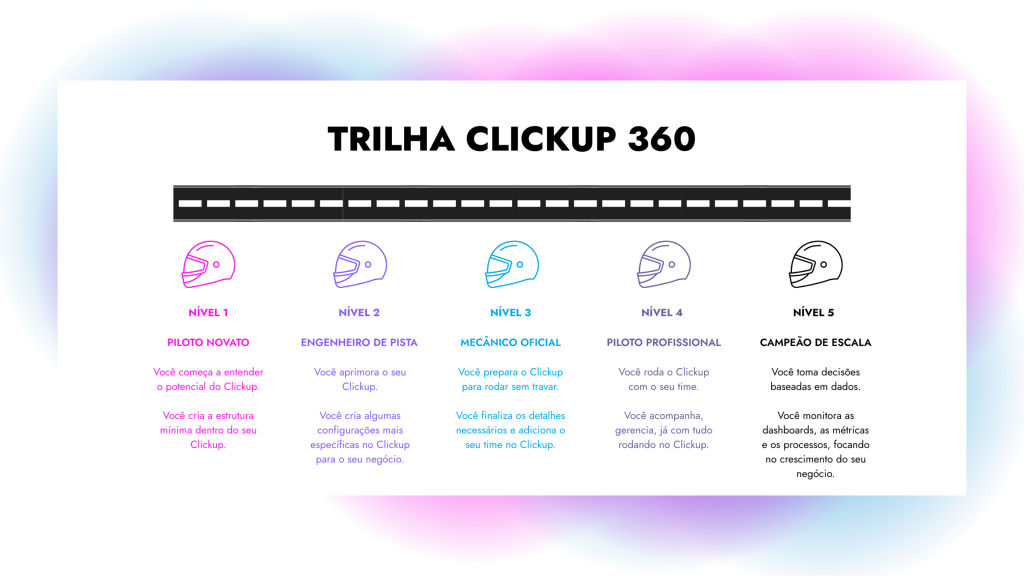 E com um caminho claro para você trilhar, separados em 5 estágios diferentes que você vai alcançando dentro do Clickup sem Caos.