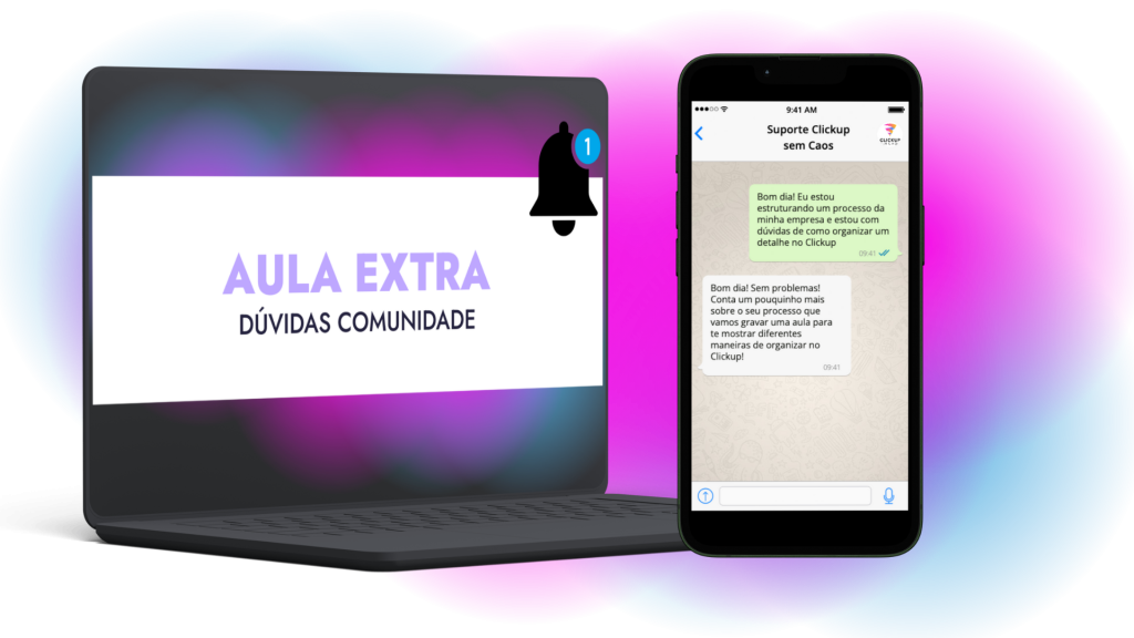 E é justamente por isso que, no Clickup sem Caos, você vai organizar junto comigo, aula a aula, com: